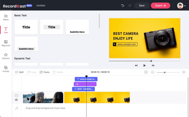 2. Metin: RecordCast, aralarından seçim yapabileceğiniz bir temel metin ve dinamik metin listesi sunar. İstediğiniz herhangi birini kullanabilir ve yazı tipini, boyutunu, rengini, hizalamasını vb. Ayarlayabilirsiniz.